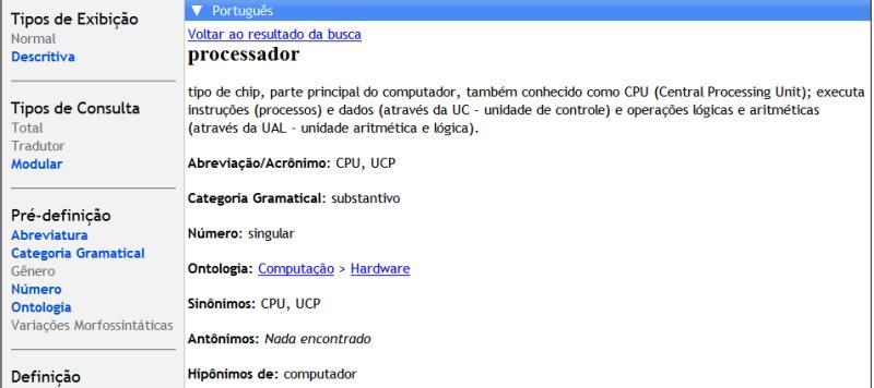 1. Exibição normal, que mostra o verbete na mesma forma que
